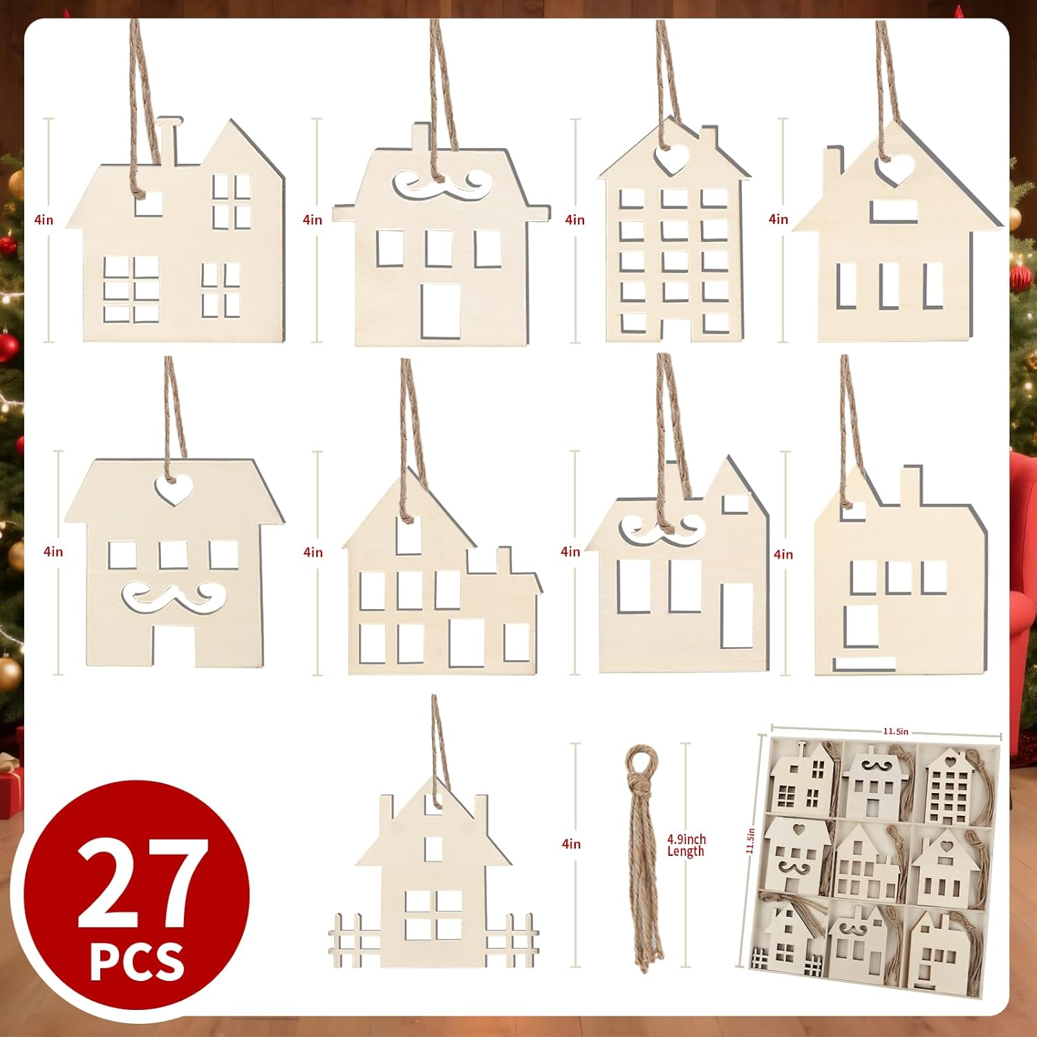 Wooden Ornaments for Christmas Tree: This set includes 27 unfinished wooden ornaments in 9 unique house shapes (3 pcs of each style) ,comes with a pre-drilled hole for easy hanging. The kit also includes burlap rope—all packed in a wooden storage box